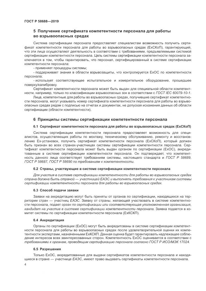 ГОСТ Р 58688-2019 Взрывоопасные среды. Правила оценки соответствия компетентности персонала, осуществляющего монтаж, техническое обслуживание, ремонт и восстановление электроустановок для применения во взрывоопасных средах