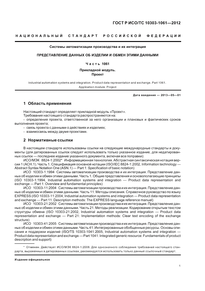 - Настоящий стандарт определяет прикладной модуль «Проект». Требования настоящего стандарта распространяются на: - определение проекта, ответственной за него организации и его плановых и фактических сроков выполнения; - связь проекта с данными о действиях и изделиях; - взаимосвязь между двумя проектами