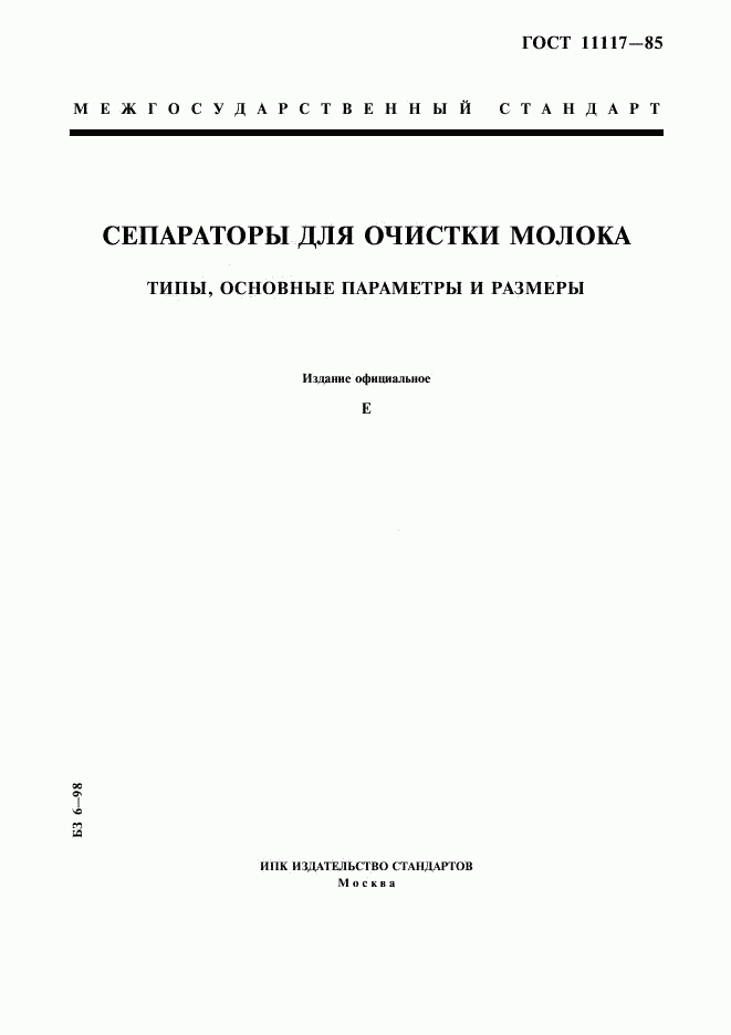 ГОСТ 11117-85 Сепараторы для очистки молока. Типы, основные параметры и размеры