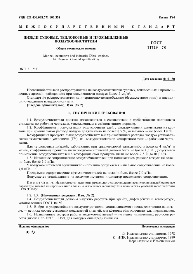 ГОСТ 11729-78 Дизели судовые, тепловозные и промышленные. Воздухоочистители. Общие технические условия