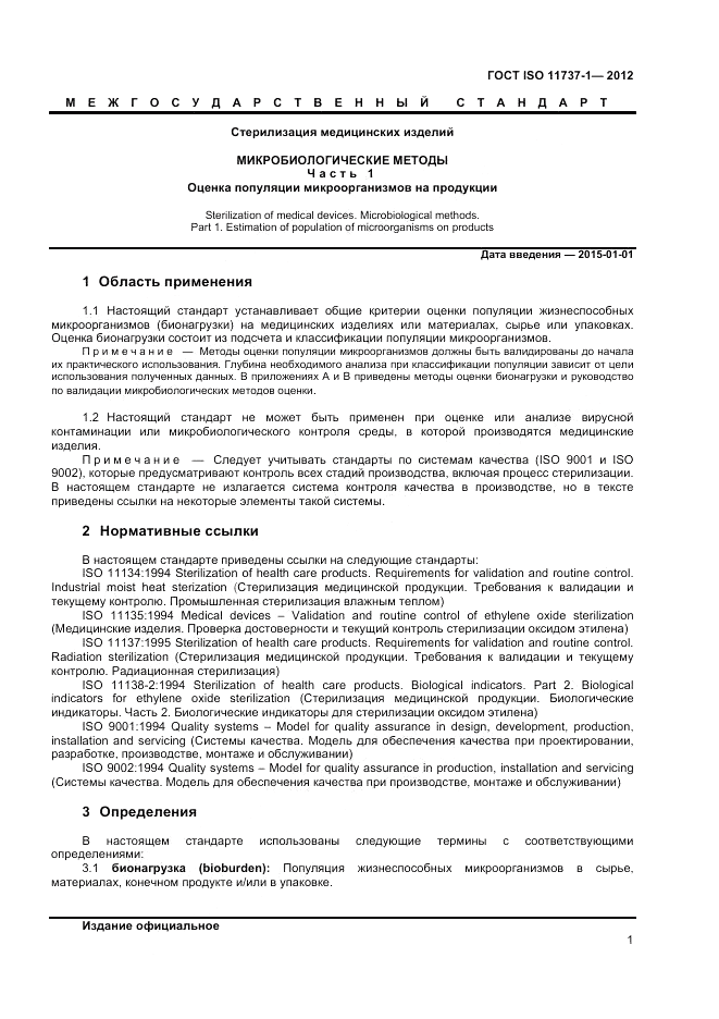 ГОСТ ISO 11737-1-2012 Стерилизация медицинских изделий. Микробиологические методы. Часть 1. Оценка популяции микроорганизмов на продукции