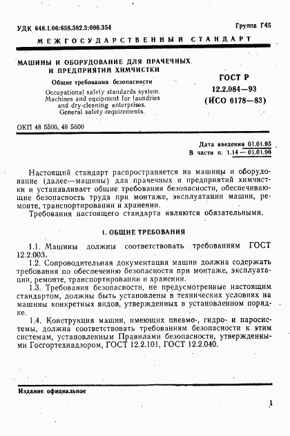 ГОСТ 12.2.084-93 Машины и оборудование для прачечных и предприятий химчистки. Общие требования безопасности