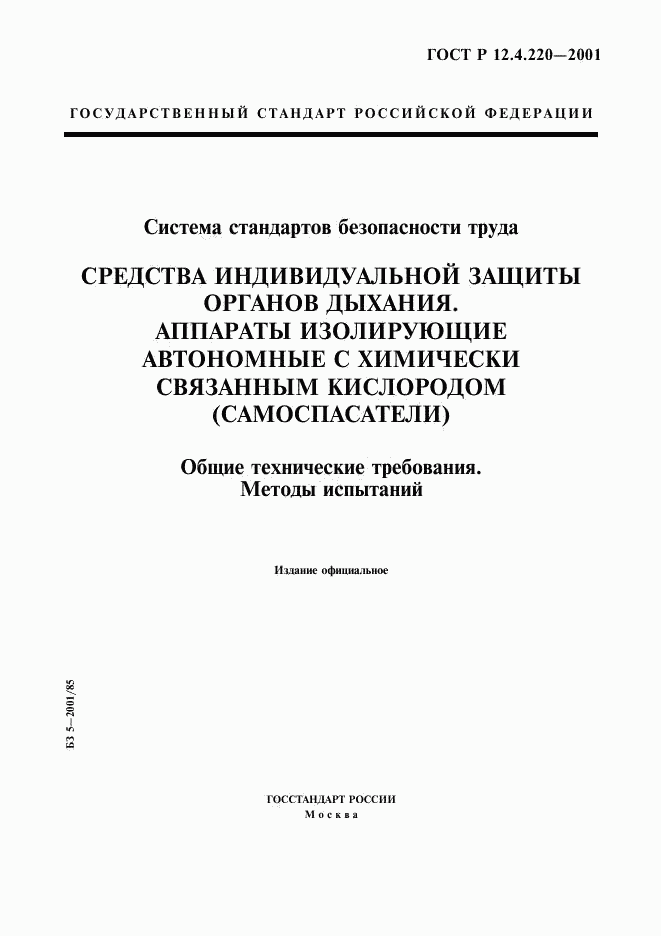 ГОСТ Р 12.4.220-2001 Система стандартов безопасности труда. Средства индивидуальной защиты органов дыхания. Аппараты изолирующие автономные с химически связанным кислородом (самоспасатели). Общие технические требования. Методы испытаний