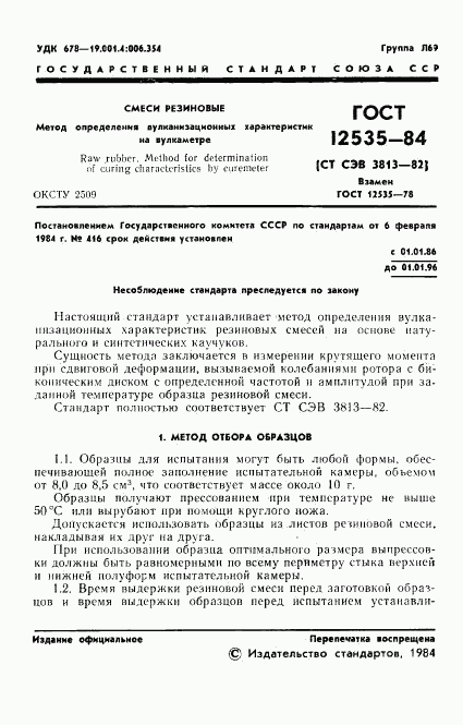 ГОСТ 12535-84 Смеси резиновые. Метод определения вулканизационных характеристик на вулкаметре