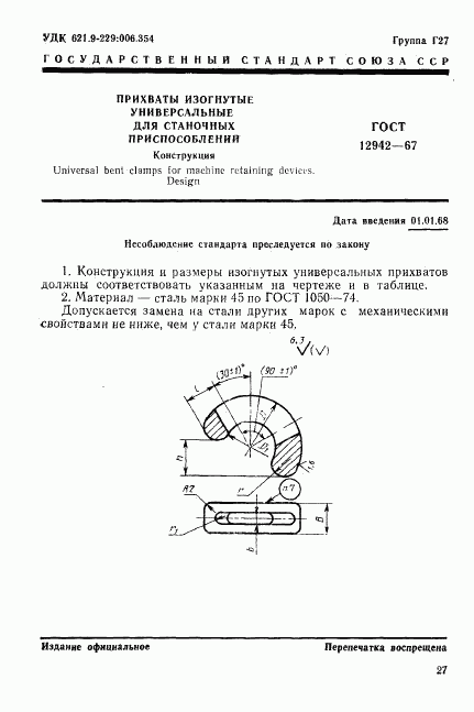ГОСТ 12942-67 Прихваты изогнутые универсальные для станочных приспособлений. Конструкция