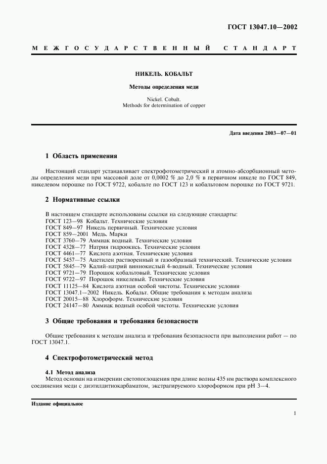 - Настоящий стандарт устанавливает спектрофотометрический и атомно-абсорбционный методы определения меди при массовой доле от 0,0002% до 2,0% в первичном никеле по ГОСТ 849, никелевом порошке по ГОСТ 9722, кобальте по ГОСТ 123 и кобальтовом порошке по ГОСТ 9721