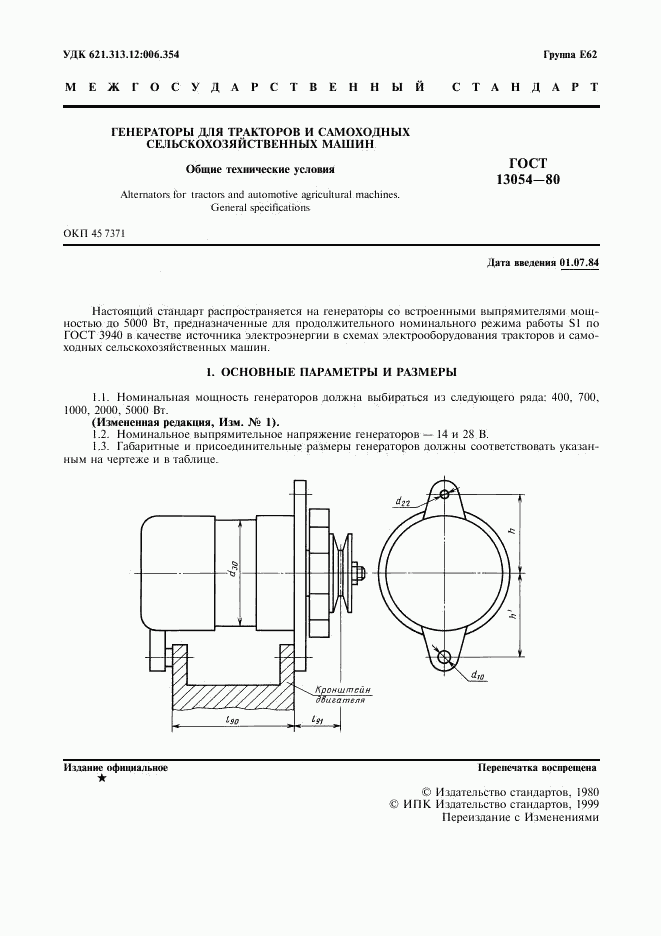 ГОСТ 13054-80 Генераторы для тракторов и самоходных сельскохозяйственных машин. Общие технические условия