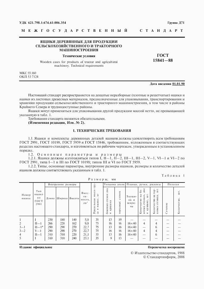ГОСТ 15841-88 Ящики деревянные для продукции сельскохозяйственного и тракторного машиностроения. Технические условия
