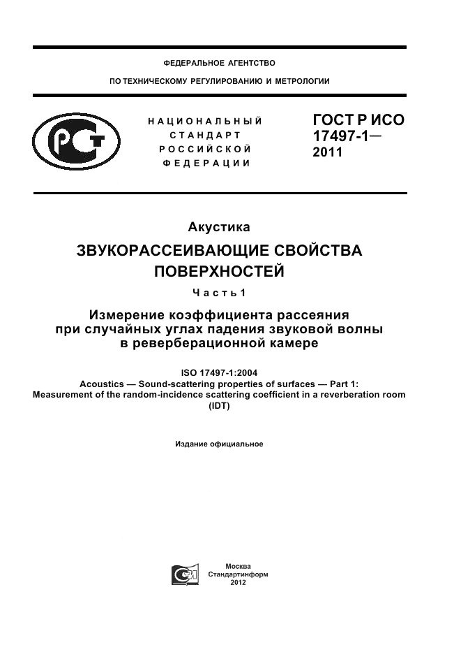 ГОСТ Р ИСО 17497-1-2011 Акустика. Звукорассеивающие свойства поверхностей. Часть 1. Измерение коэффициента рассеяния при случайных углах падения звуковой волны в реверберационной камере