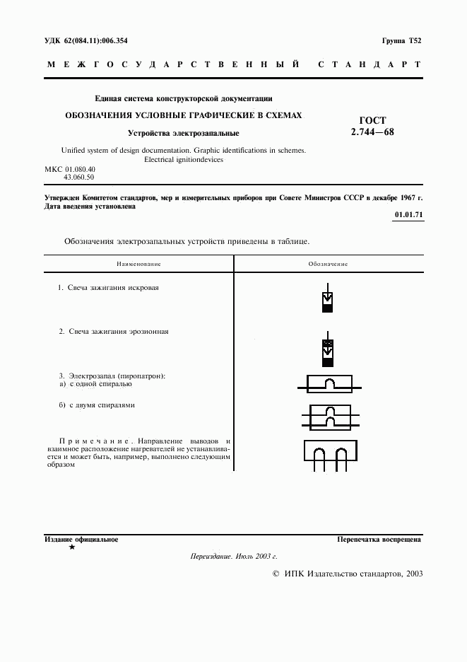 ГОСТ 2.744-68 Единая система конструкторской документации. Обозначения условные графические в схемах. Устройства электрозапальные