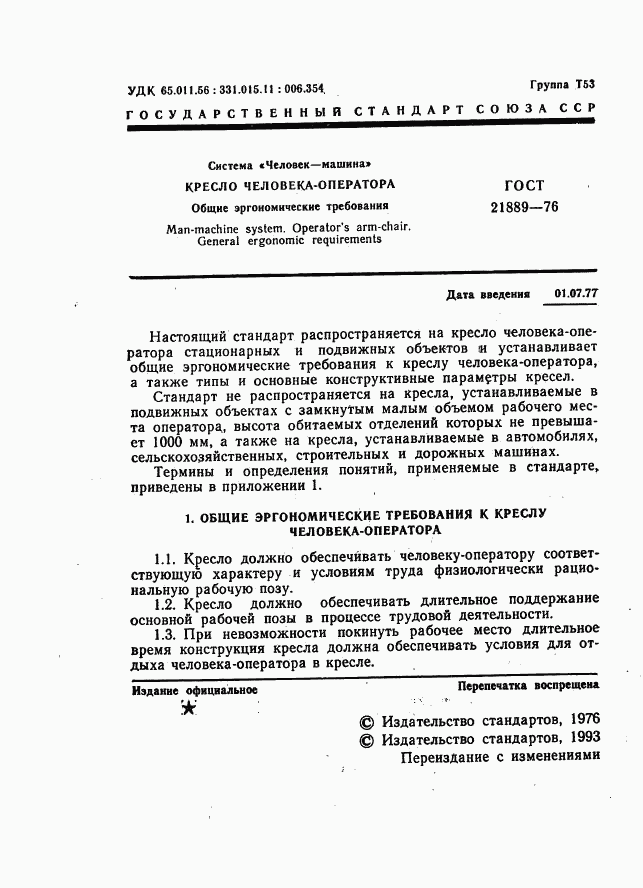 ГОСТ 21889-76 Система "Человек-машина". Кресло человека-оператора. Общие эргономические требования