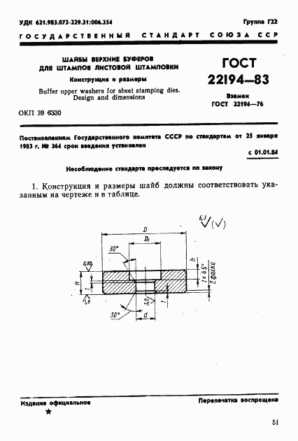 ГОСТ 22194-83 Шайбы верхние буферов для штампов листовой штамповки. Конструкция и размеры