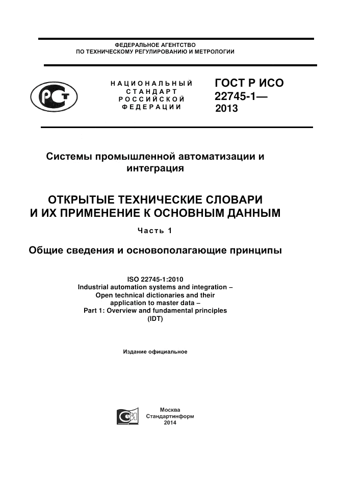 ГОСТ Р ИСО 22745-1-2013 Системы промышленной автоматизации и интеграция. Открытые технические словари и их применение к основным данным. Часть 1. Общие сведения и основополагающие принципы