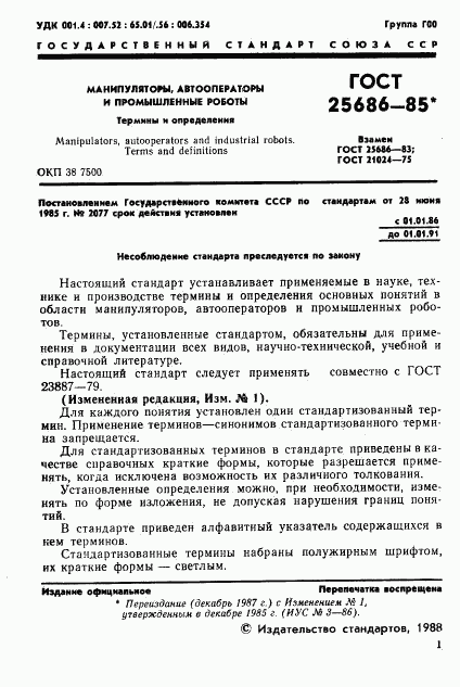 ГОСТ 25686-85 Манипуляторы, автооператоры и промышленные роботы. Термины и определения