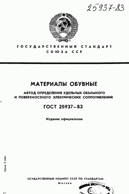ГОСТ 25937-83 Материалы обувные. Метод определения удельных объемного и поверхностного электрических сопротивлений