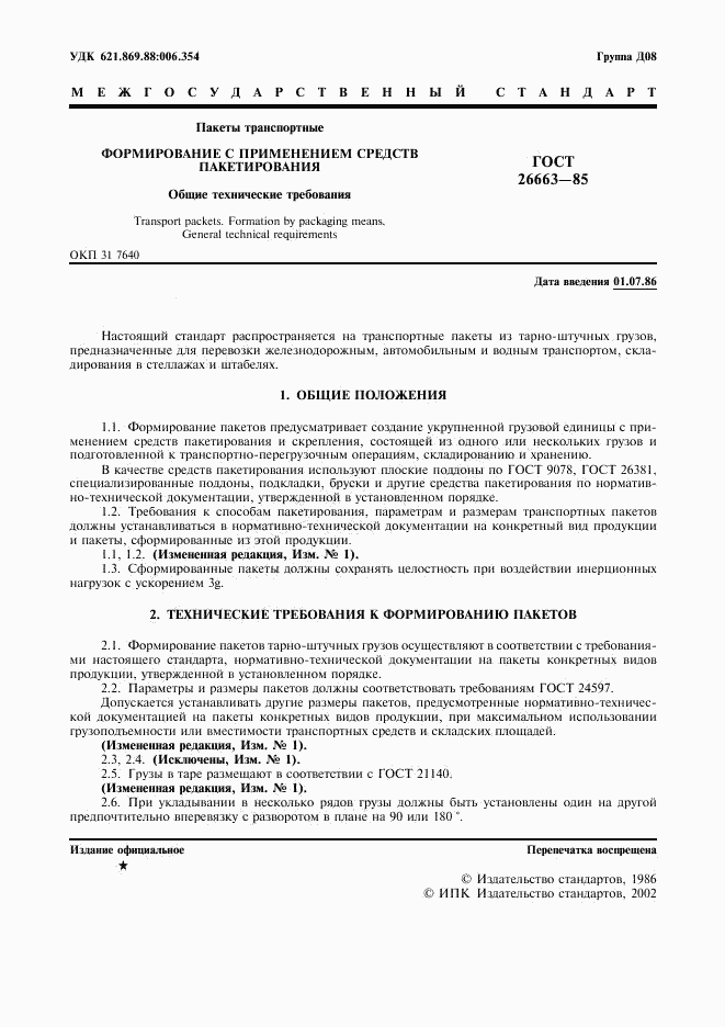 ГОСТ 26663-85 Пакеты транспортные. Формирование с применением средств пакетирования. Общие технические требования