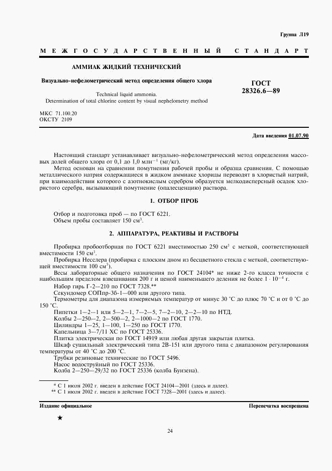ГОСТ 28326.6-89 Аммиак жидкий технический. Визуально-нефелометрический метод определения общего хлора