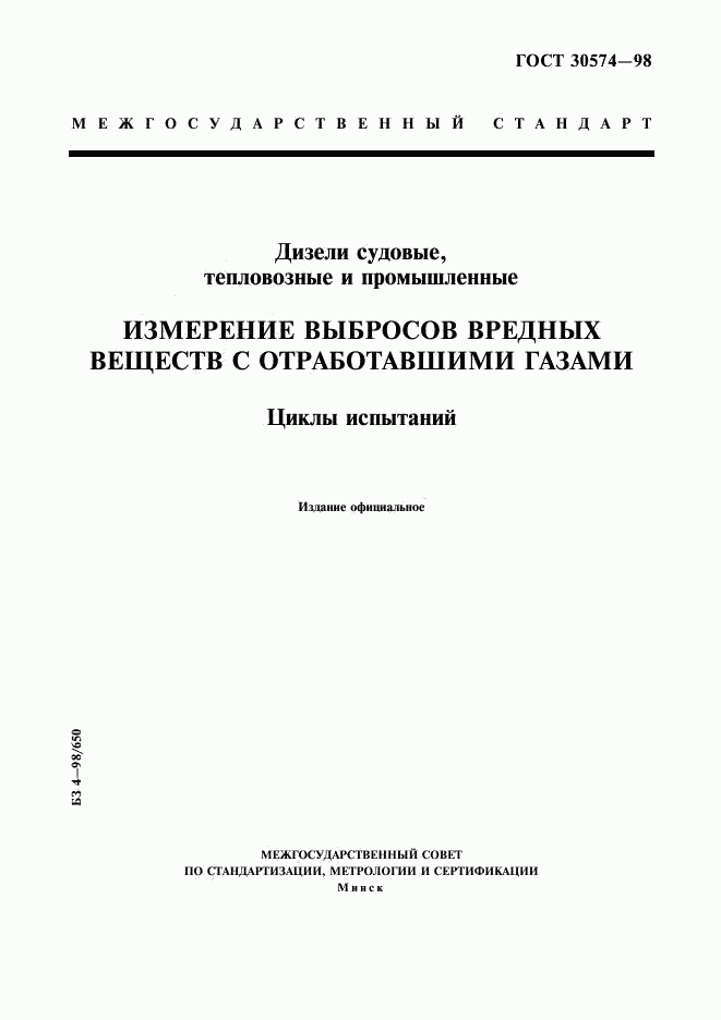 ГОСТ 30574-98 Двигатели внутреннего сгорания поршневые. Выбросы вредных веществ и дымность отработавших газов. Циклы испытаний