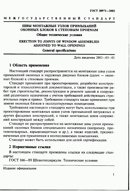 - Настоящий стандарт распространяется на монтажные швы узлов примыканий оконных и наружных дверных блоков к стеновым проемам. Стандарт применяют при проектировании, разработке конструкторской и технологической документации, а также производстве работ при строительстве, реконструкции и ремонте зданий и сооружений различного назначения с учетом требований действующих строительных норм и правил. Требования стандарта также применяют при замене оконных блоков в эксплуатируемых помещениях. Требования настоящего стандарта могут быть использованы при проектировании монтажных швов узлов примыканий витражных и других фасадных конструкций, а также монтажных швов сопряжений конструкций между собой. Стандарт не распространяется на монтажные швы узлов примыканий оконных блоков специального назначения (например, противопожарных, взрывозащитных и др.), а также изделий, предназначенных для применения в неотапливаемых помещениях. Стандарт может быть использован для целей сертификации