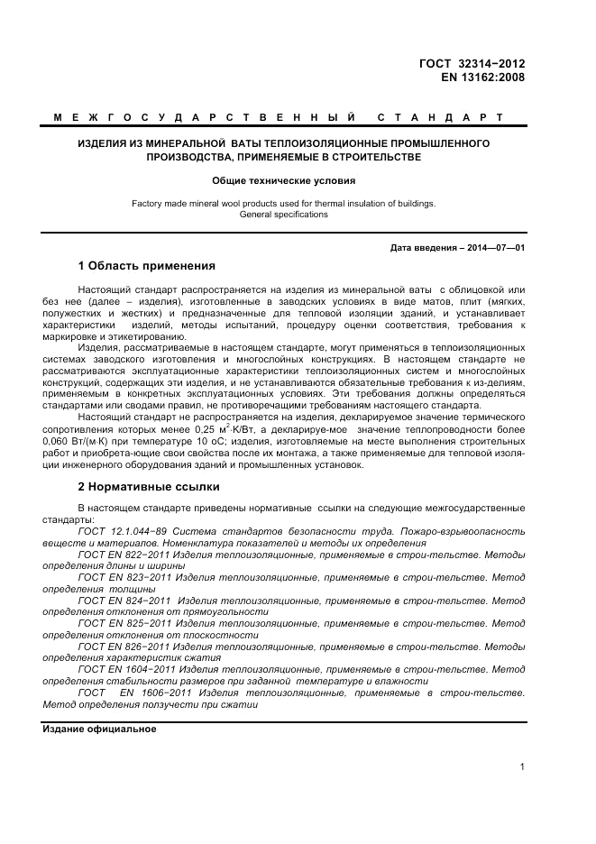 - Настоящий стандарт распространяется на изделия из минеральной ваты с облицовкой или без нее (далее - изделия), изготовленные в заводских условиях в виде матов, плит (мягких, полужестких и жестких) и предназначенные для тепловой изоляции зданий, и устанавливает характеристики изделий, методы испытаний, процедуру оценки соответствия, требования к маркировке и этикетированию. Изделия, рассматриваемые в настоящем стандарте, могут применяться в теплоизоляционных системах заводского изготовления и многослойных конструкциях. В настоящем стандарте не рассматриваются эксплуатационные характеристики теплоизоляционных систем и многослойных конструкций, содержащих эти изделия, и не устанавливаются обязательные требования к изделиям, применяемым в конкретных эксплуатационных условиях. Эти требования должны определяться стандартами или сводами правил, не противоречащими требованиям настоящего стандарта. Настоящий стандарт не распространяется на изделия, декларируемое значение термического сопротивления которых менее 0,25 м в степени 2 K/Вт, а декларируемое значение теплопроводности более 0,060 Вт/(мК) при температуре 10 °С; изделия, изготовляемые на месте выполнения строительных работ и приобретающие свои свойства после их монтажа, а также применяемые для тепловой изоляции инженерного оборудования зданий и промышленных установок