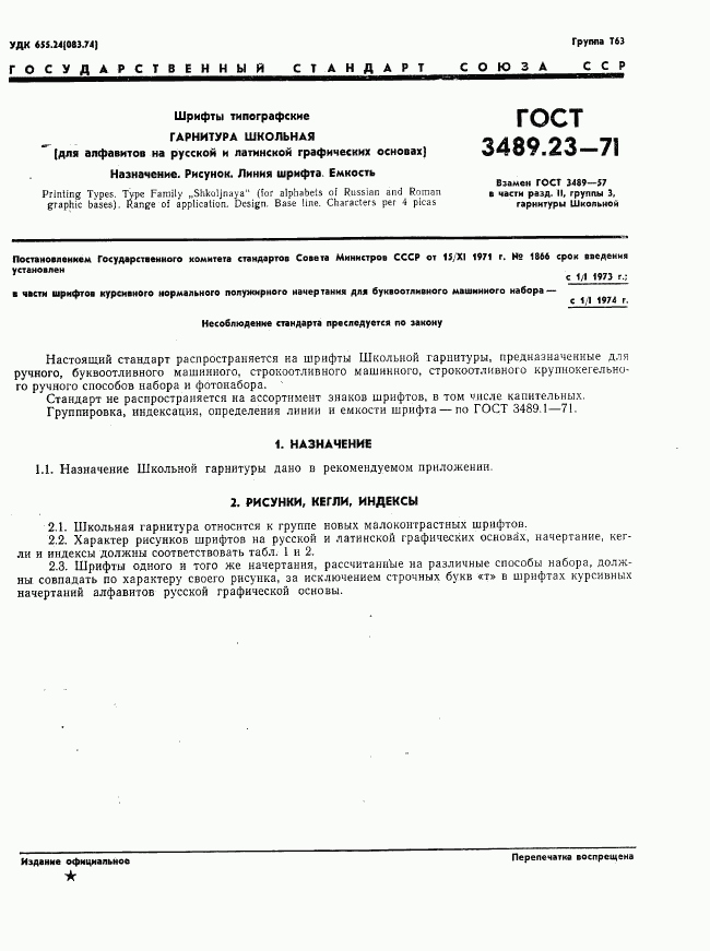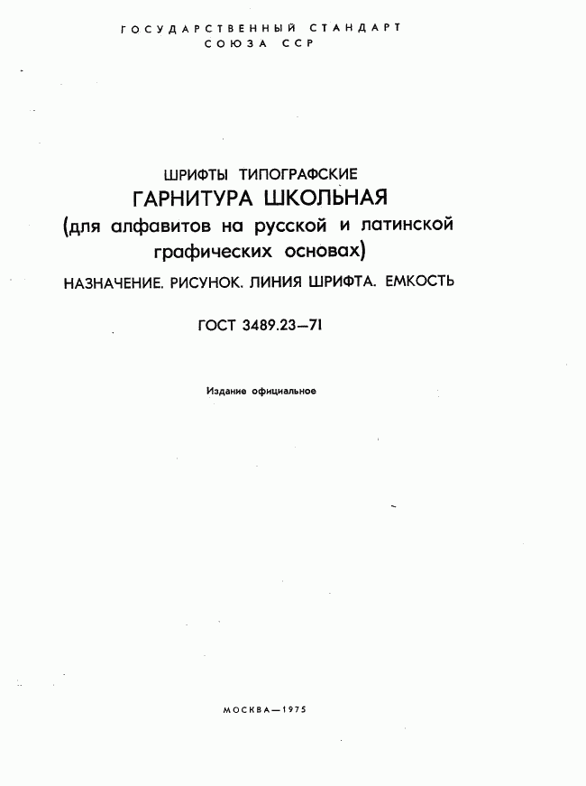 ГОСТ 3489.23-71 Шрифты типографские. Гарнитура Школьная (для алфавитов на русской и латинской графических основах). Назначение. Рисунок. Линия шрифта. Емкость