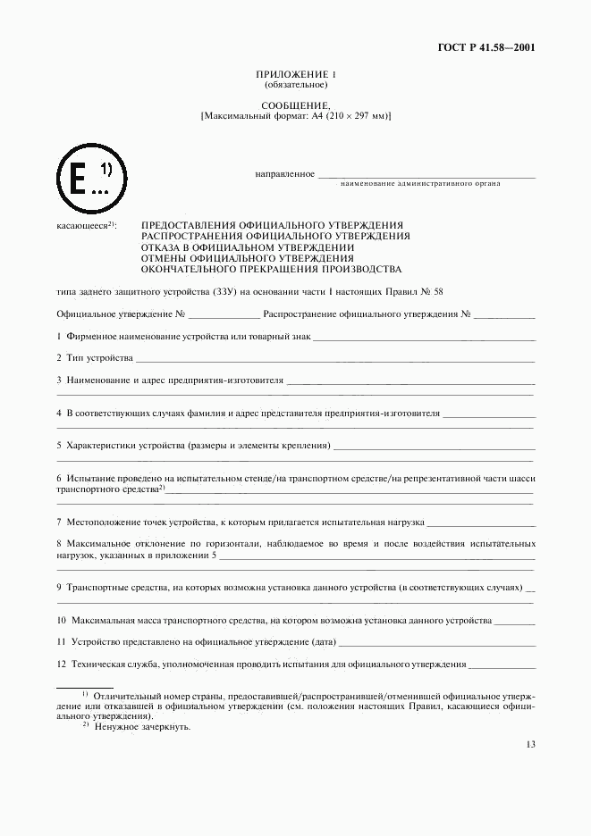 ГОСТ Р 41.58-2001 Единообразные предписания, касающиеся официального утверждения: I. Задних защитных устройств; II. Транспортных средств в отношении установки задних защитных устройств официально утвержденного типа; III. Транспортных средств в отношении их задней защиты