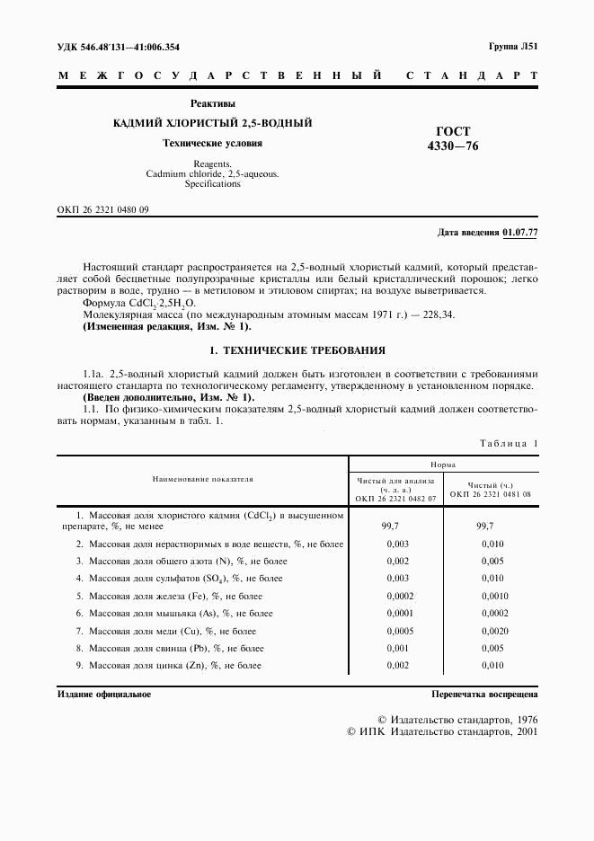 ГОСТ 4330-76 Реактивы. Кадмий хлористый 2,5-водный. Технические условия