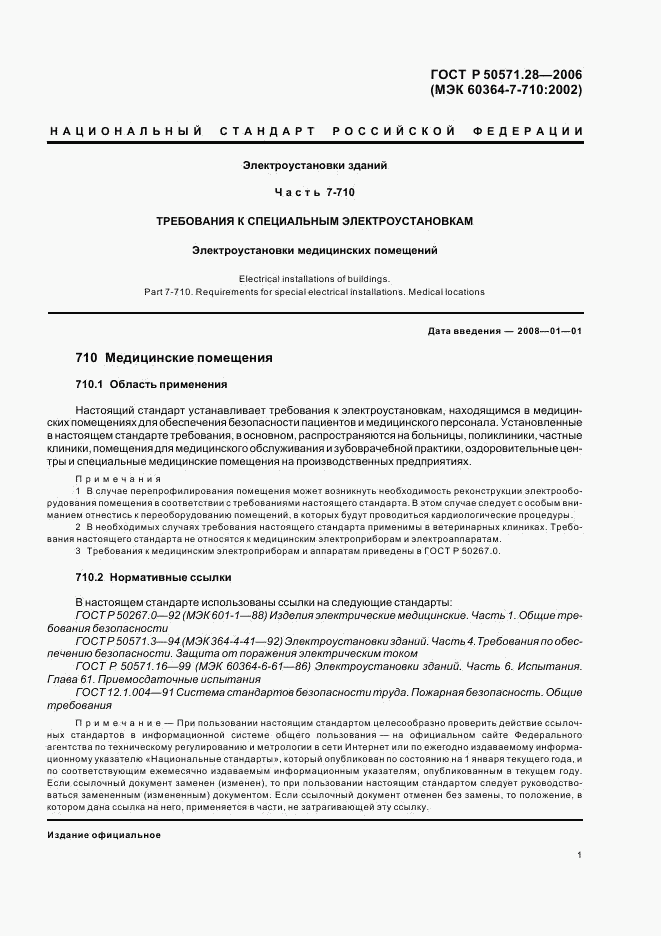 ГОСТ Р 50571.28-2006 Электроустановки зданий. Часть 7-710. Требования к специальным электроустановкам. Электроустановки медицинских помещений