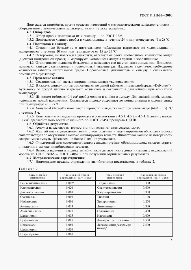ГОСТ Р 51600-2000 Молоко. Методы определения наличия антибиотиков