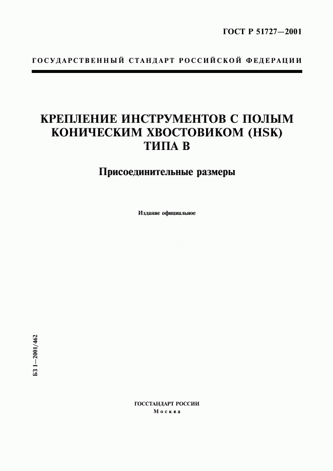 ГОСТ Р 51727-2001 Крепление инструментов с полым коническим хвостовиком (HSK) типа В. Присоединительные размеры