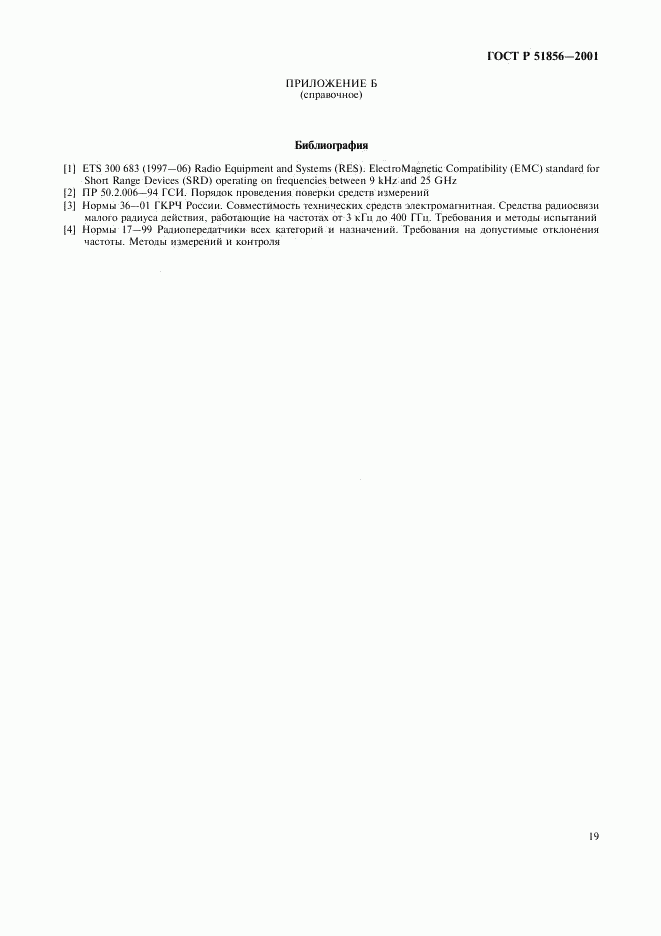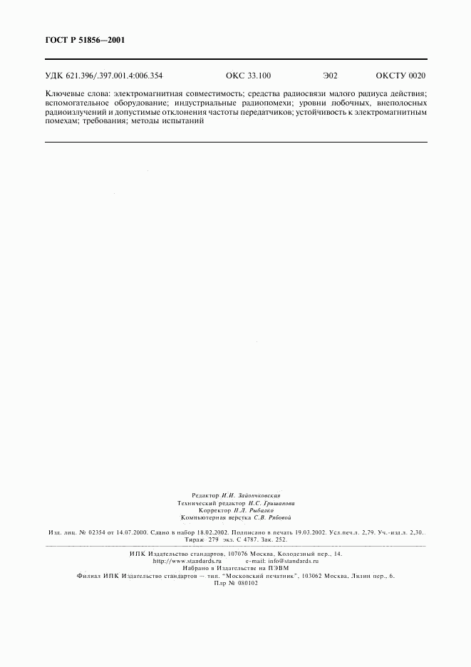 ГОСТ Р 51856-2001 Совместимость технических средств электромагнитная. Средства радиосвязи малого радиуса действия, работающие на частотах от 3 кГц до 400 ГГц. Требования и методы испытаний