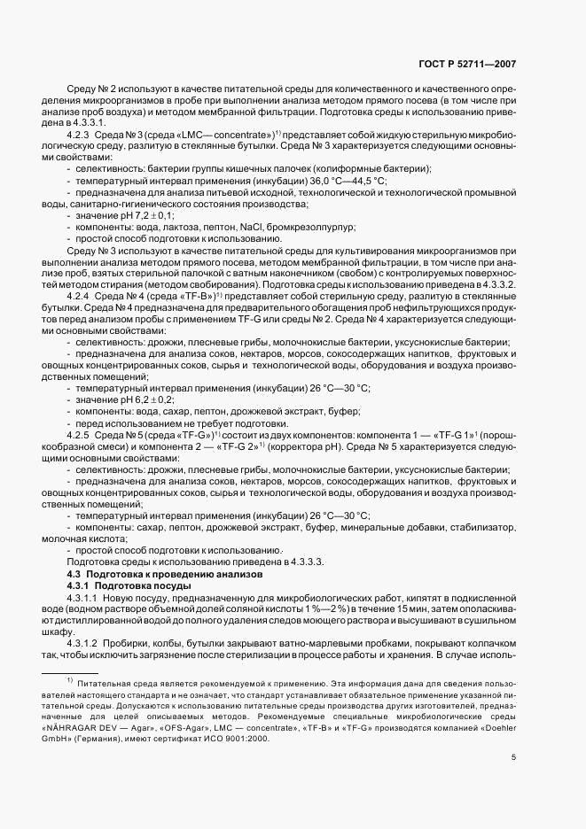 - Настоящий стандарт распространяется на консервы: фруктовые и овощные соки, нектары, морсы и сокосодержащие напитки; фруктовые и овощные концентрированные соки, а также сырье, питьевую исходную, технологическую, технологическую промывную воду, оборудование и воздух производственных помещений и устанавливает методы их микробиологического анализа с применением специальных микробиологических сред: - количественный метод определения мезофильных аэробных и факультативно анаэробных микроорганизмов; - качественный метод выявления бактерий группы кишечных палочек (колиформных бактерий) в питьевой исходной, технологической и технологической промывной воде; - количественный и качественный методы определения дрожжей, плесневых грибов, молочнокислых и уксуснокислых бактерий; - качественный метод подтверждения отсутствия в готовых продуктах микроорганизмов, вызывающих их порчу (дрожжей, плесневых грибов, молочнокислых и уксуснокислых бактерий); - качественный метод подтверждения отсутствия в готовых продуктах индикаторной, патогенной и условно-патогенной лимитируемой микрофлоры, мезофильных клостридий, сульфитредуцирующих клостридий, сальмонелл. Методы предназначены для определения количества или качественного выявления микроорганизмов: - прямым посевом в специальные микробиологические среды определенного объема (массы) анализируемой пробы или ее разведения; - с применением мембранной фильтрации