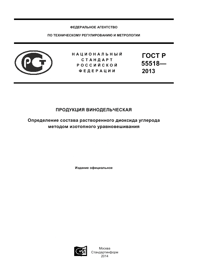 ГОСТ Р 55518-2013 Продукция винодельческая. Определение состава растворенного диоксида углерода методом изотопного уравновешивания