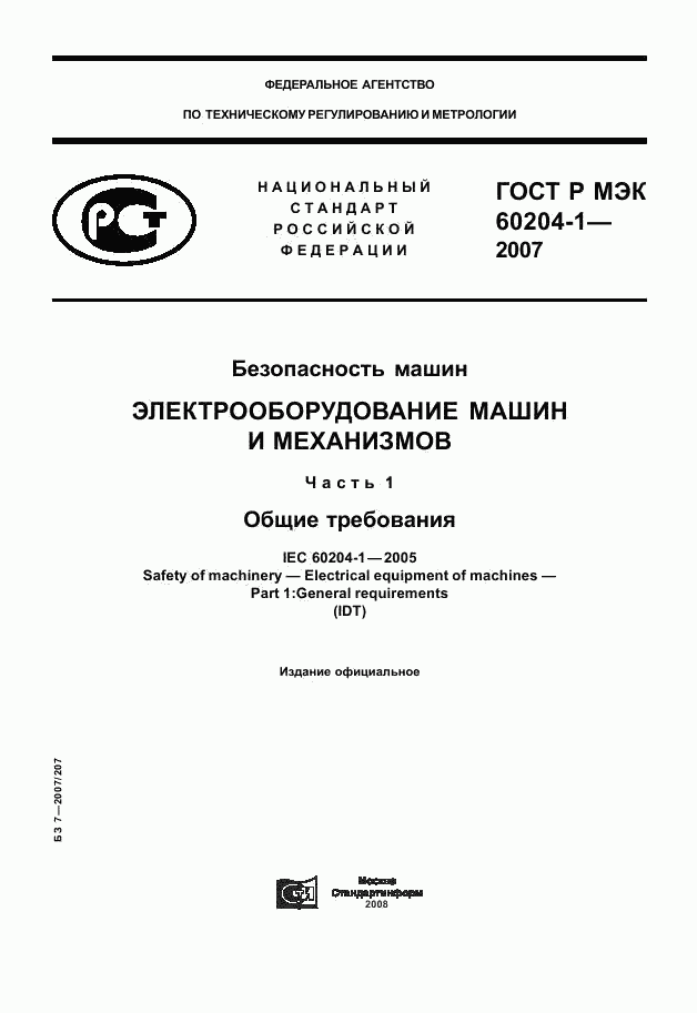 ГОСТ Р МЭК 60204-1-2007 Безопасность машин. Электрооборудование машин и механизмов. Часть 1. Общие требования