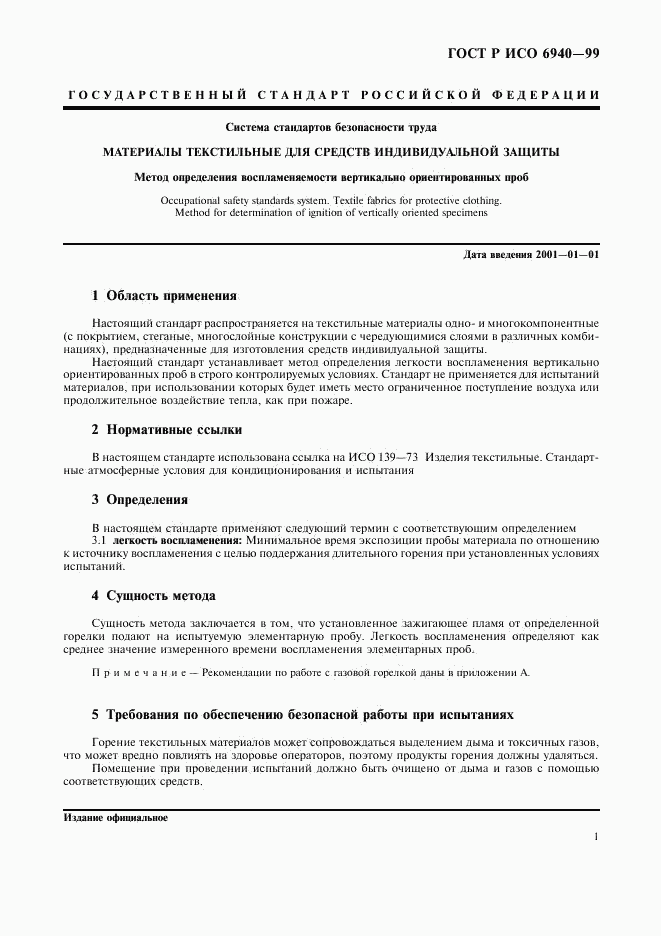 - Настоящий стандарт распространяется на текстильные материалы одно- и многокомплектные (с покрытием, стеганые, многослойные конструкции с чередующимися слоями в различных комбинациях), предназначенные для изготовления средств индивидуальной защиты. Настоящий стандарт устанавливает метод определения легкости воспламенения вертикально ориентированных проб в строго контролируемых условиях. Стандарт не применяется для испытаний материалов, при использовании которых будет иметь место ограниченное поступление воздуха или продолжительное воздействие тепла, как при пожаре