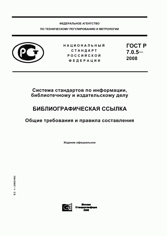 ГОСТ Р 7.0.5-2008 Система стандартов по информации, библиотечному и издательскому делу. Библиографическая ссылка. Общие требования и правила составления