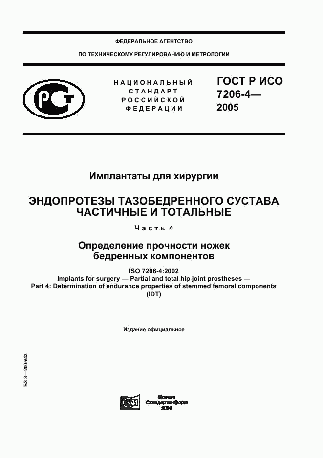 ГОСТ Р ИСО 7206-4-2005 Имплантаты для хирургии. Эндопротезы тазобедренного сустава частичные и тотальные. Часть 4. Определение прочности ножек бедренных компонентов