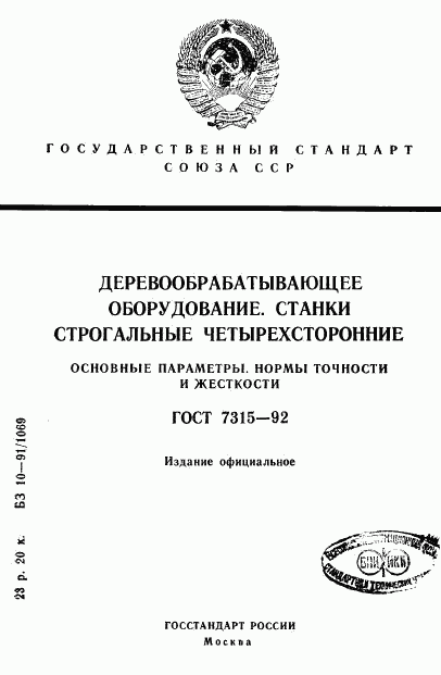 ГОСТ 7315-92 Деревообрабатывающее оборудование. Станки строгальные четырехсторонние. Основные параметры. Нормы точности и жесткости