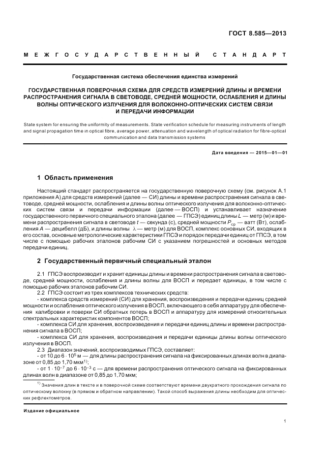 ГОСТ 8.585-2013 Государственная система обеспечения единства измерений. Государственная поверочная схема для средств измерений длины и времени распространения сигнала в световоде, средней мощности, ослабления и длины волны оптического излучения для волоконно-оптических систем связи и передачи информации