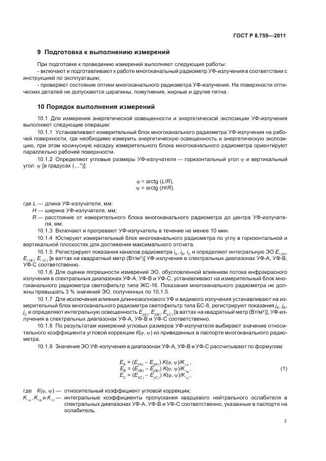 - Настоящий стандарт распространяется на методику измерений энергетической освещенности и энергетической экспозиции ультрафиолетового (УФ) излучения в фотобиологии. Настоящий стандарт устанавливает требования к погрешности измерений, к характеристикам применяемых средств измерений, требования безопасности, методы измерений энергетической освещенности и энергетической экспозиции. Для измерения энергетической освещенности (далее – ЭО) и энергетической экспозиции (далее – ЭЭ) УФ-излучения применяют многоканальные радиометры УФ-излучения, поверенные в качестве рабочих средств измерений и обеспечивающие измерения в диапазонах длин волн УФ-А (0,315 – 0,4 мкм), УФ-В (0,0,28 – 0,315 мкм) и УФ-С (0,2 – 0,28 мкм) измерения ЭО соответственно в диапазонах 0,1 – 100,0; 0,01 – 10,0 и 0,001 – 10,0 Вт/м2; ЭЭ – в диапазонах 1,0 – 1000,0; 0,1 – 100,0 и 0,01 – 100,0 Дж/м2
