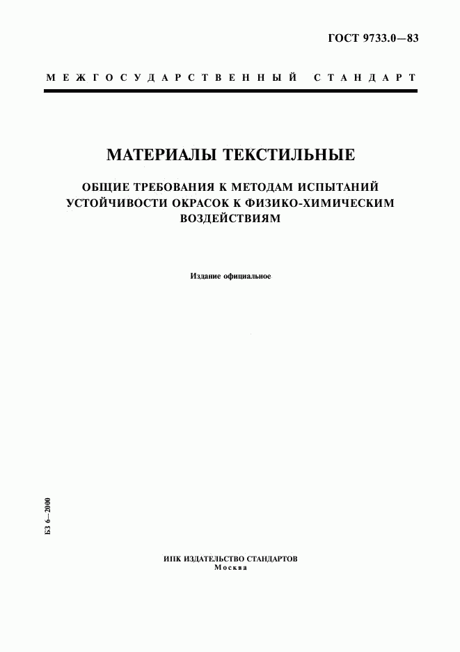 ГОСТ 9733.0-83 Материалы текстильные. Общие требования к методам испытаний устойчивости окрасок к физико-химическим воздействиям