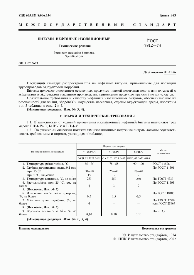 ГОСТ 9812-74 Битумы нефтяные изоляционные. Технические условия